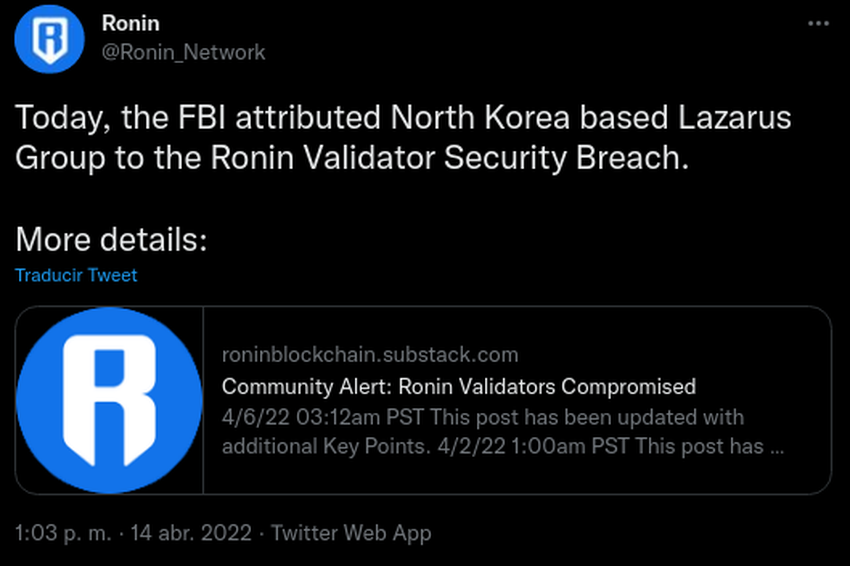 Tim Ronin baru saja menambahkan informasi terbaru pada laman blog resminya. Mereka mengungkapkan bahwa FBI menyalahkan Lazarus Group, yang berbasis di Korea Utara, atas pembobolan keamanan dalam peretasan.