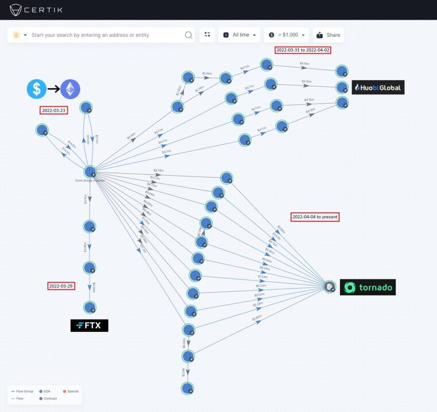 Akun Twitter @CertiKAlert—milik perusahaan audit proyek kripto CertiK—merilis bagan yang berisi informasi perputaran dana hasil curian dari kasus peretasan Ronin Network.