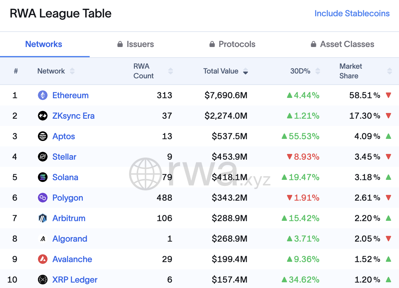 Aptos Network membuat gebrakan di industri kripto. Jaringan ini berhasil menempati posisi ketiga dalam peringkat global aset dunia nyata (RWA), hanya di belakang Ethereum dan ZKsync Era.