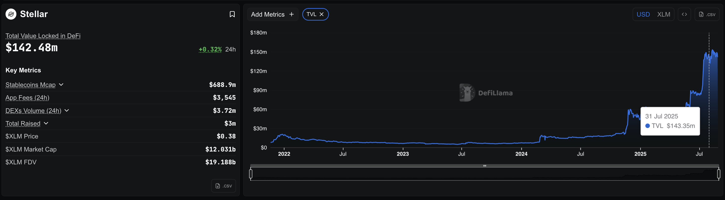 Data menunjukkan total value locked (TVL) Stellar di DeFi hampir tidak bergerak. Pada 31 Juli, TVL Stellar sebesar US$143,35 juta. Pada 27 Agustus, sedikit turun menjadi US$142,48 juta.