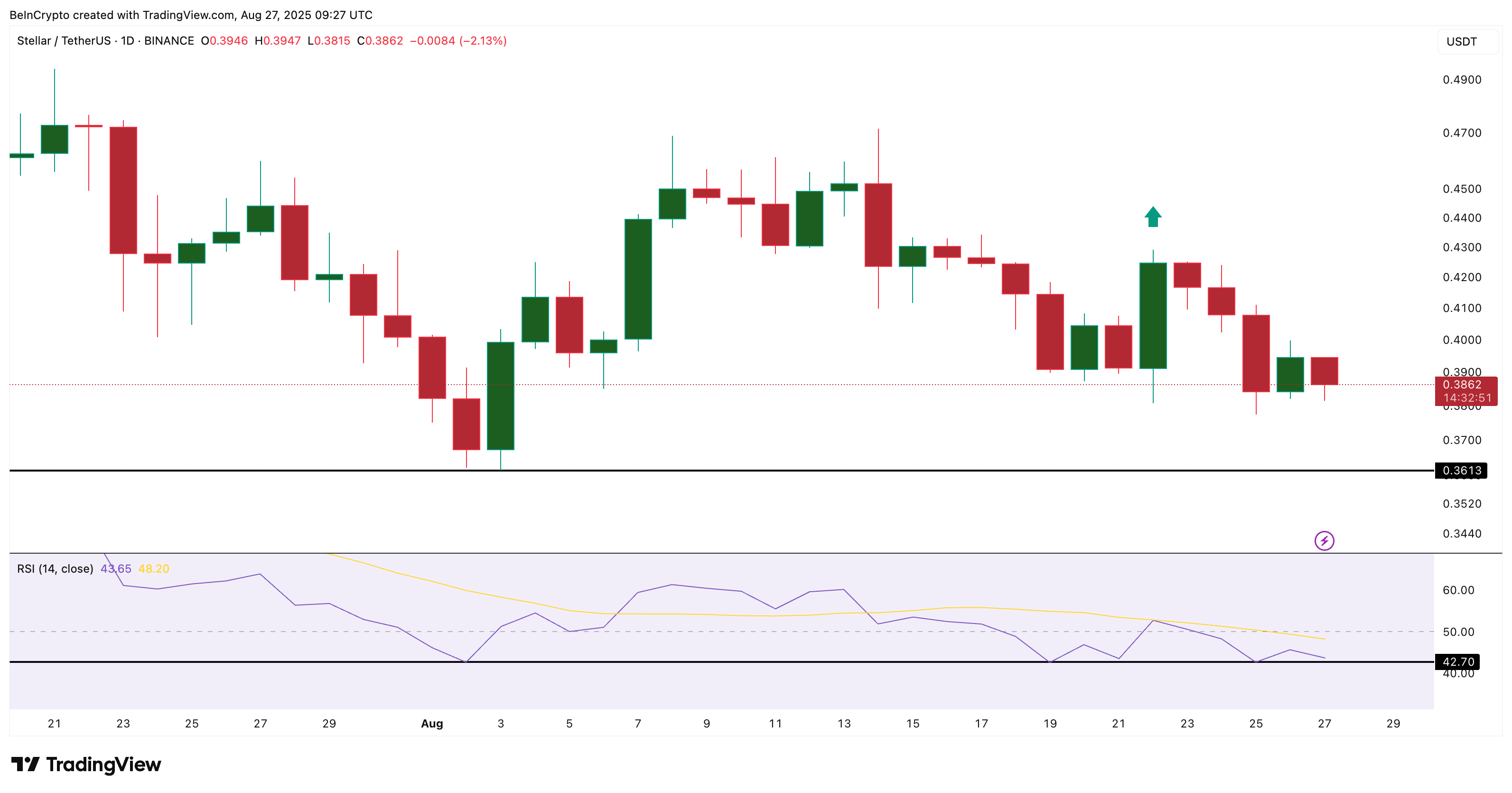 Selain arus modal, sinyal teknikal menambah lapisan analisis lain. RSI harian Stellar berulang kali menguji floor yang sama (42,70) tanpa menembus ke bawah. Ini menunjukkan bahwa penjual gagal mengambil kendali penuh.