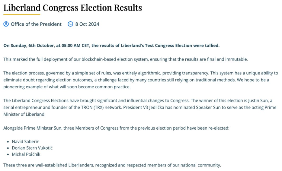 Negara Eropa yang sebagian besar teoretis ini, yang dikembangkan oleh libertarian sayap kanan pada tahun 2015, mengadakan pemilihan pada 5 Oktober. Meskipun tidak signifikan, mengingat Liberland hanya mengklaim memiliki 2,7 mil dari dataran banjir yang diperebutkan dan tidak berpenghuni antara Kroasia dan Serbia, Justin Sun kini menjadi kepala negara.