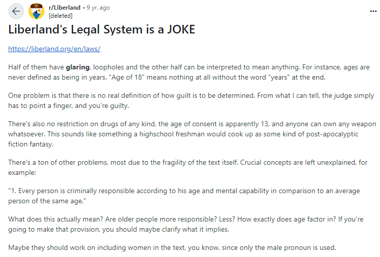 SponsoredHukum di Liberland cukup kontroversial, menurut sebuah pos Reddit, dengan sikap seperti tidak ada pembatasan pada narkoba dan senjata api.
