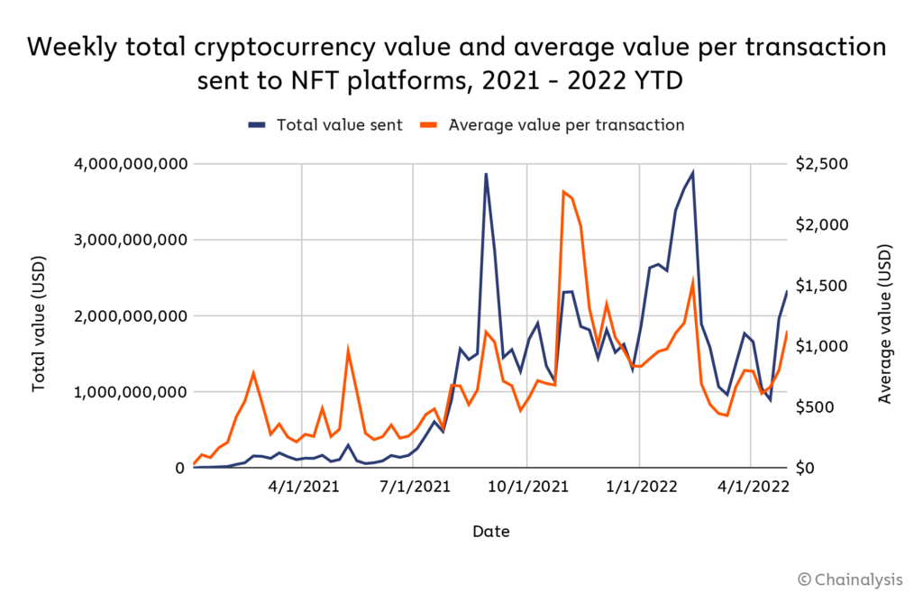 Berdasarkan catatan Chainalysis, volume transaksi NFT terpantau tumbuh signifikan sejak awal tahun 2021. Namun, pertumbuhan itu fluktuatif. Aktivitas NFT terlihat surut dan mengalir dari bulan ke bulan.