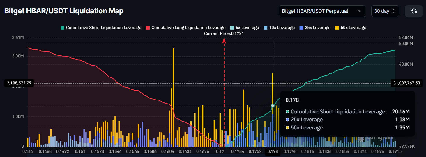 Peta likuidasi menunjukkan peristiwa signifikan bagi trader short. Saat harga HBAR mendekati US$0,178, posisi short berisiko menghadapi likuidasi sebesar US$20 juta. Level resistance ini sangat penting, dan jika HBAR menembusnya, ini bisa mengubah sentimen trader dari bearish menjadi bullish.
