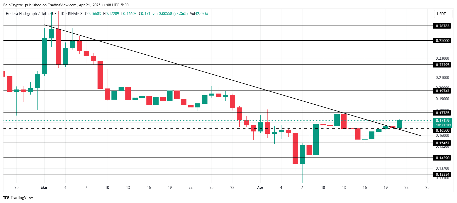HBAR saat ini diperdagangkan pada US$0,171, menandai kenaikan 3,3% hari ini. Meskipun kenaikan ini tampak sederhana, aksi harga ini lebih signifikan dalam konteks mematahkan tren penurunan selama tujuh minggu. Perubahan ini menciptakan optimisme di kalangan investor, dan ini menunjukkan bahwa altcoin ini siap untuk pemulihan lebih lanjut.