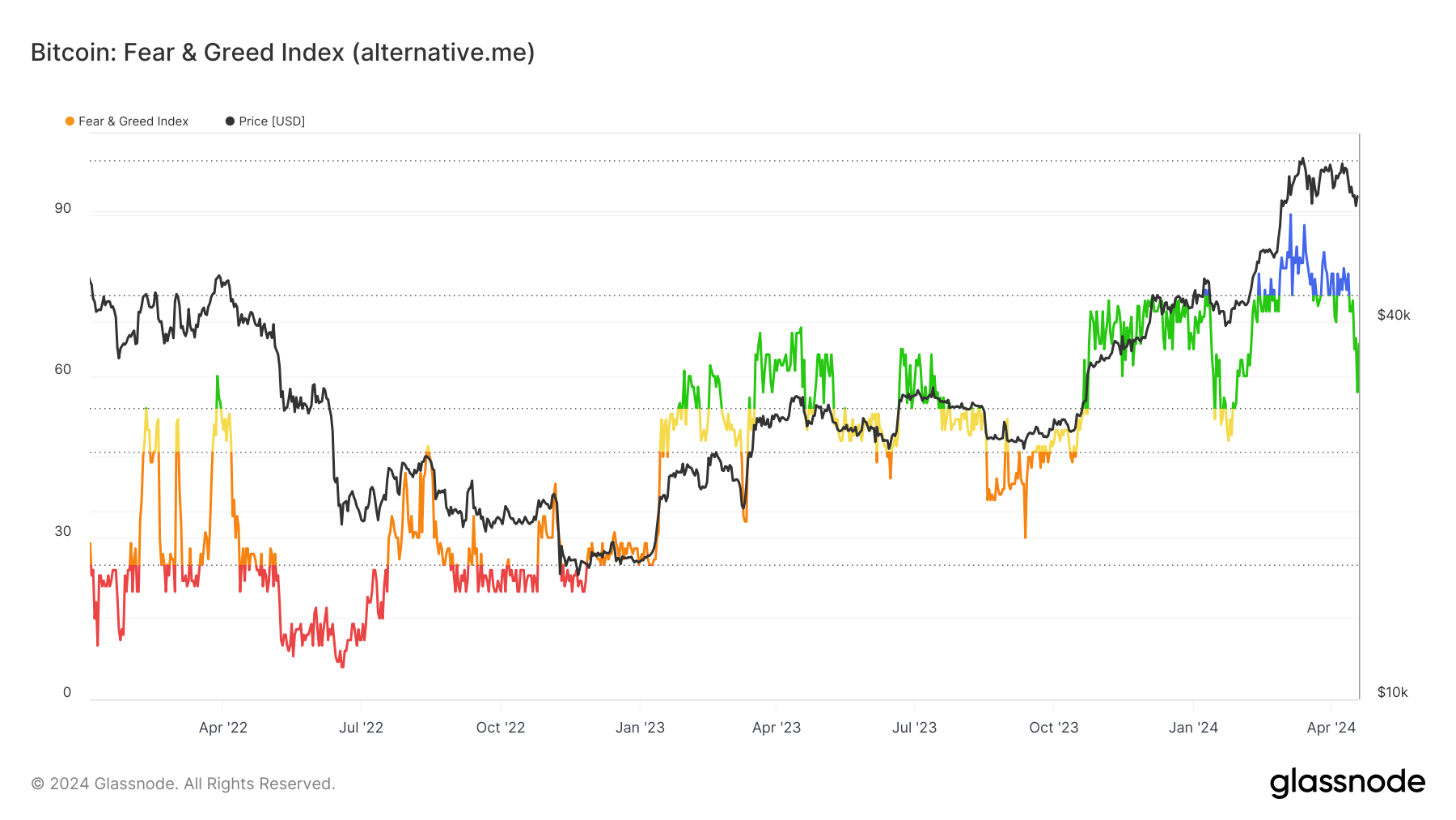 Sang penasihat menunjukkan bahwa sentimen pasar, yang diukur dengan Fear and Greed Index, saat ini menunjukkan “keserakahan” atau “greed“. Alhasil, kondisi ini mengisyaratkan adanya overvaluation dan potensi koreksi yang akan datang. Davila menyarankan, meskipun terjadi halving dan peluncuran exchange-traded fund (ETF) Bitcoin spot, “pendekatan analitis harus tetap sama”.