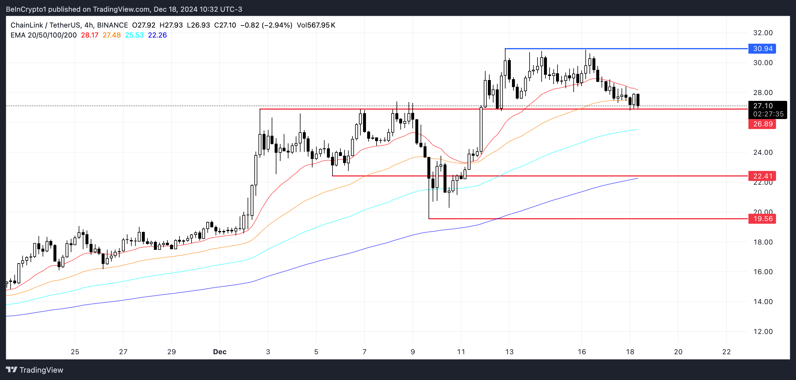 Jika support di US$26,89 gagal bertahan, harga LINK bisa menghadapi penurunan lebih lanjut, berpotensi turun ke US$22,41 atau bahkan US$19,56.
