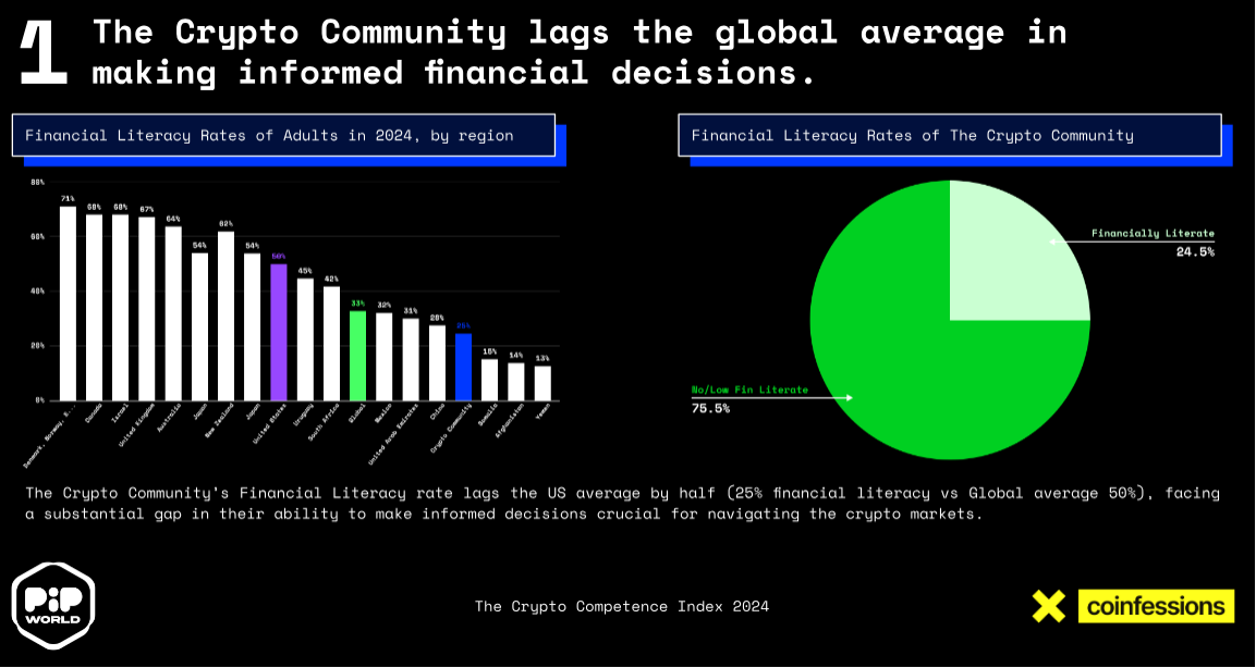 Literasi keuangan yang ada di komunitas kripto berada pada level yang memprihatinkan. Laporan Crypto Competence Index 2024 dari PiP World menyebutkan bahwa angkanya hanya mencapai 25%. Hal itu menunjukkan tingginya gap dalam kemampuan individu untuk membuat keputusan investasi di ruang kripto.