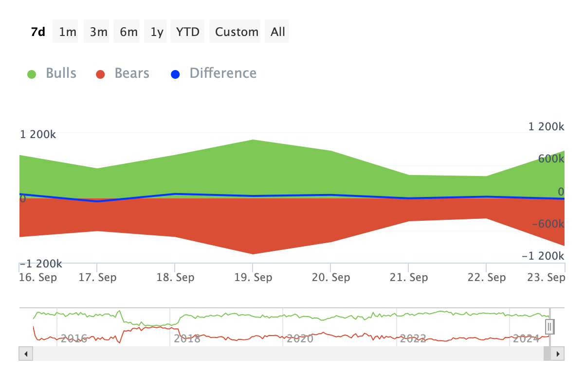 Meskipun mungkin terlalu dini untuk menyimpulkan, indikator Bulls dan Bears tampaknya mendukung kenaikan lebih lanjut. Bulls adalah alamat yang membeli setidaknya 1% dari total periode perdagangan dalam jangka waktu tertentu. Bears, di sisi lain, adalah mereka yang menjual volume serupa.