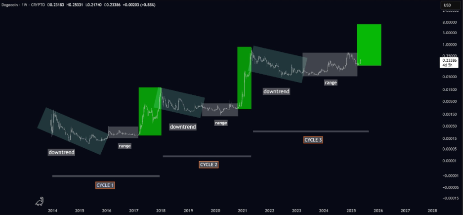 Sentimen analis nampaknya juga semakin optimistis. Galaxy, seorang pengamat pasar kripto yang banyak diikuti, memprediksi bahwa harga DOGE mungkin memasuki “siklus bull ketiga.” Analis tersebut menunjukkan pola yang sudah populer di mana Dogecoin terbang di bawah radar sebelum lonjakan perhatian dan harga yang cepat.