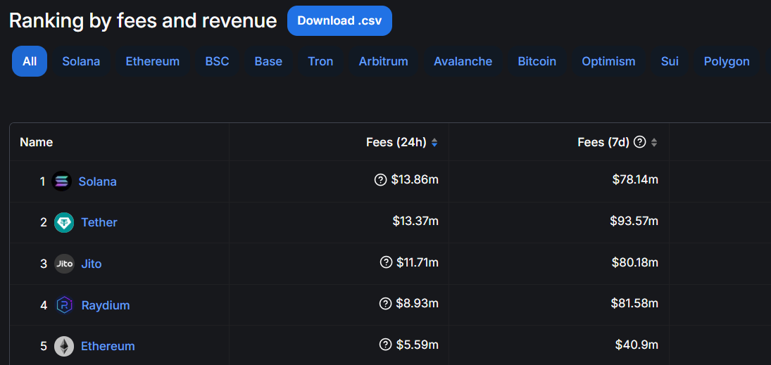 Data dari DeFiLlama menunjukkan bahwa kenaikan biaya jaringan ini berkontribusi signifikan pada pendapatan Solana sekitar US$78,14 juta dalam biaya selama seminggu terakhir, menempatkannya di antara jaringan paling menguntungkan. Solana berada tepat di bawah Tether dengan US$93,57 juta namun jauh melampaui Ethereum yang menghasilkan US$40,9 juta dalam periode yang sama.