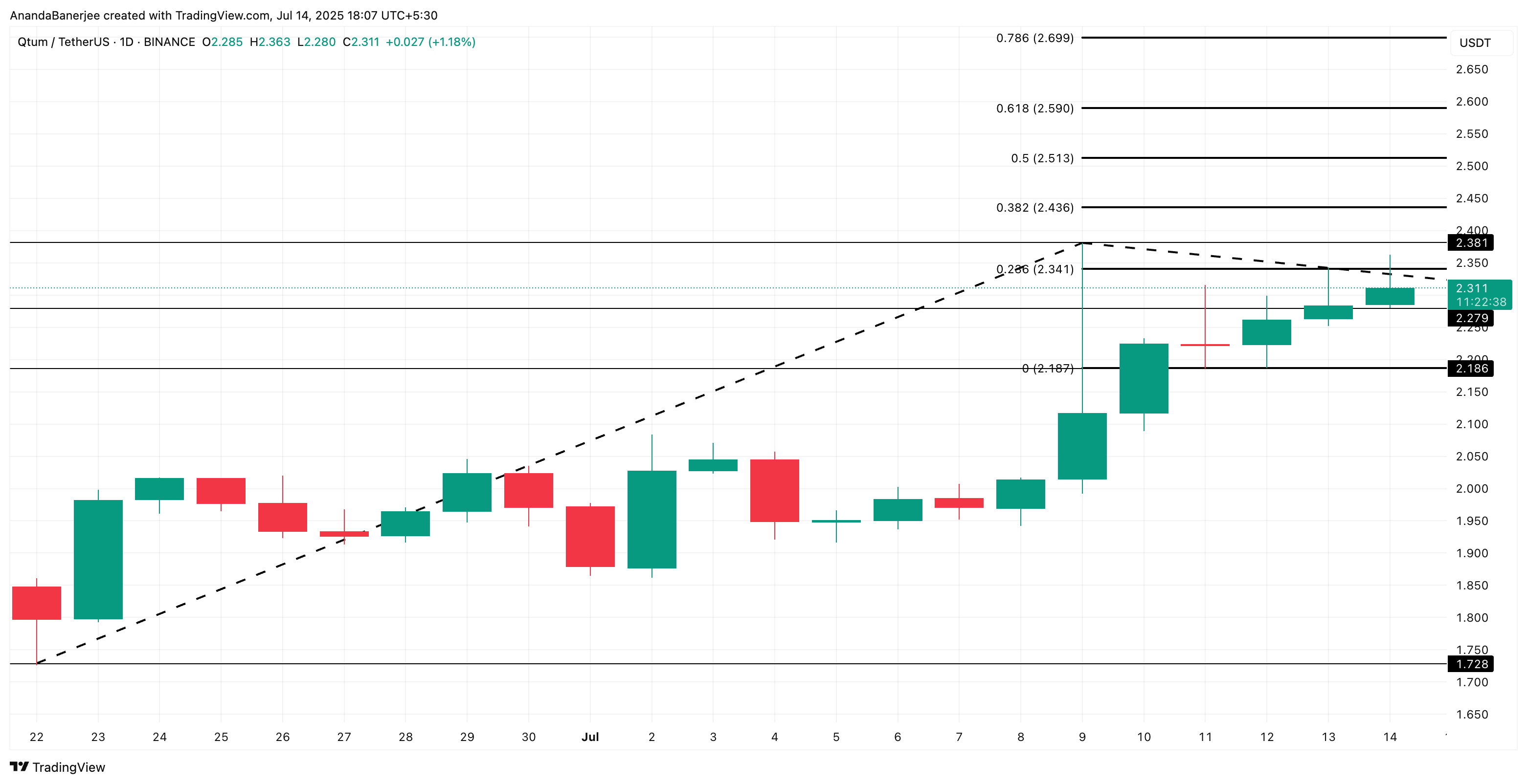 Tren tetap terjaga selama QTUM bertahan di atas US$2,187, titik koreksi minor. Jika para bull berhasil mendorong melewati resistance US$2,341 lagi dengan volume, target berikutnya menjadi US$2,436, diikuti oleh US$2,513, menurut ekstensi Fibonacci.