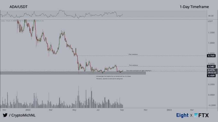 Seorang trader kripto @CryptoMichNL telah membagikan cuitannya yang berisikan grafik ADA. Pada cuitan tersebut, ia menyampaikan prediksinya bahwa harga ADA berpotensi melesat naik masing-masing ke area US$0,55 dan US$0,75.