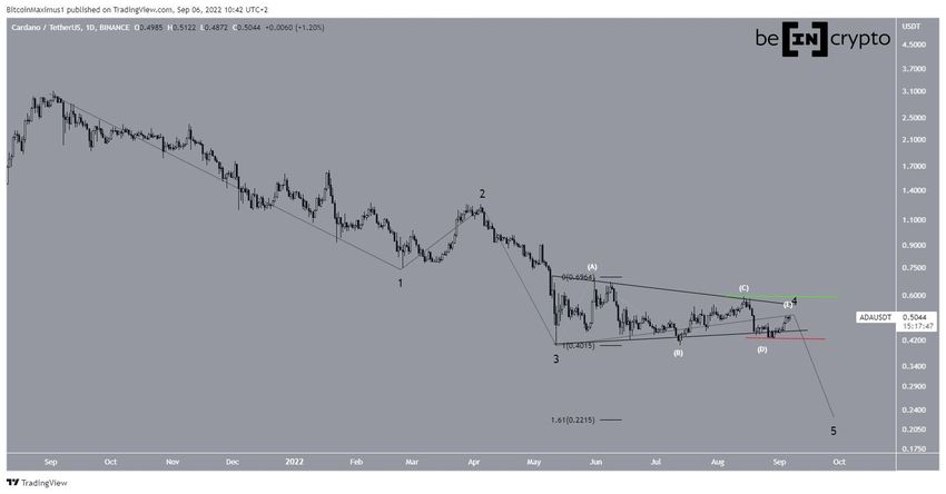 Apabila indikator count ini akurat, maka harganya akan turun dari segitiga tersebut dan terus turun hingga mencapai titik US$0,22, yang merupakan level support terdekat berikutnya. Saat mengukur ketinggian segitiga, Fibonacci retracement eksternal 1,61 akan memberitahu kita di mana letak targetnya.