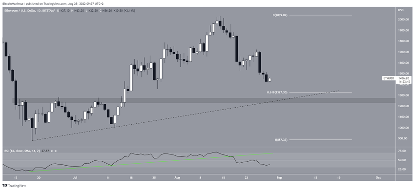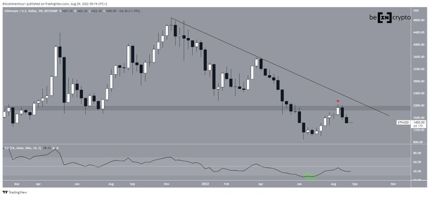 Sejak mencapai level tertinggi sepanjang masa (ATH) di harga US$4.868 pada bulan November 2021, Ethereum terus bergerak turun di bawah garis descending resistance. Sejauh ini, tren penurunan tersebut telah menghasilkan level terendah lokal ETH di titik US$880 yang terbentuk pada bulan Juni 2022. Level terendah baru sepanjang masa (ATL) pada indikator RSI mingguan tercapai pada saat yang sama dengan level terendah sebelumnya (lingkaran hijau).