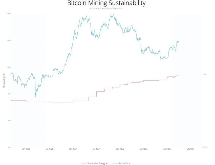 Sang peneliti kemudian juga menambahkan sebuah grafik tentang keberlanjutan mining Bitcoin. Angka ini turun sedikit namun tetap dekat dengan nilai puncaknya yaitu 54%.