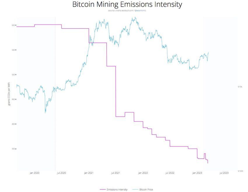 Intensitas emisi yang dihasilkan dari aktivitas mining Bitcoin terpantau sudah turun ke level terendahnya sepanjang masa, menurut data dari Woo Charts. Sehubungan dengan ini, salah seorang investor ventura dan aktivis teknologi lingkungan Daniel Batten mengunggah temuan tersebut pada 3 April.
