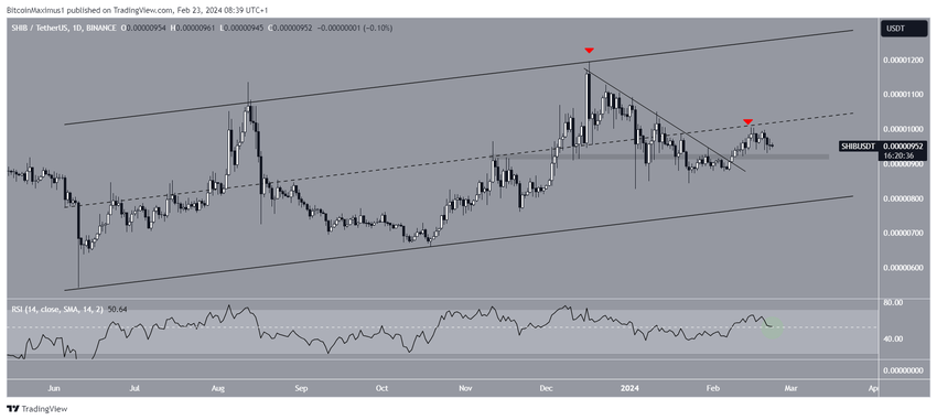 Analisis teknikal pada time frame harian menunjukkan bahwa harga SHIB telah diperdagangkan di dalam saluran paralel naik sejak Juni 2023. Kemudian, tepatnya pada 17 Desember, tren naik ini bermuara pada puncak harga US$0,0000120. Setelah itu, SHIB mulai tergelincir ke bawah garis tren resistance menurun (descending resistance), hingga menyentuh bagian bawah saluran terkait.