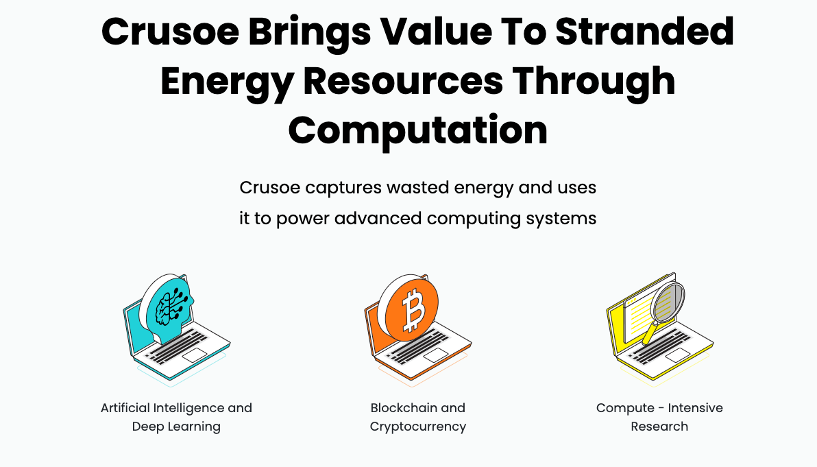 Crusoe mengklaim merupakan pelopor infrastruktur komputasi bersih (clean computing) yang mengurangi biaya dan dampak lingkungan dari ekonomi digital yang berkembang di seluruh dunia.