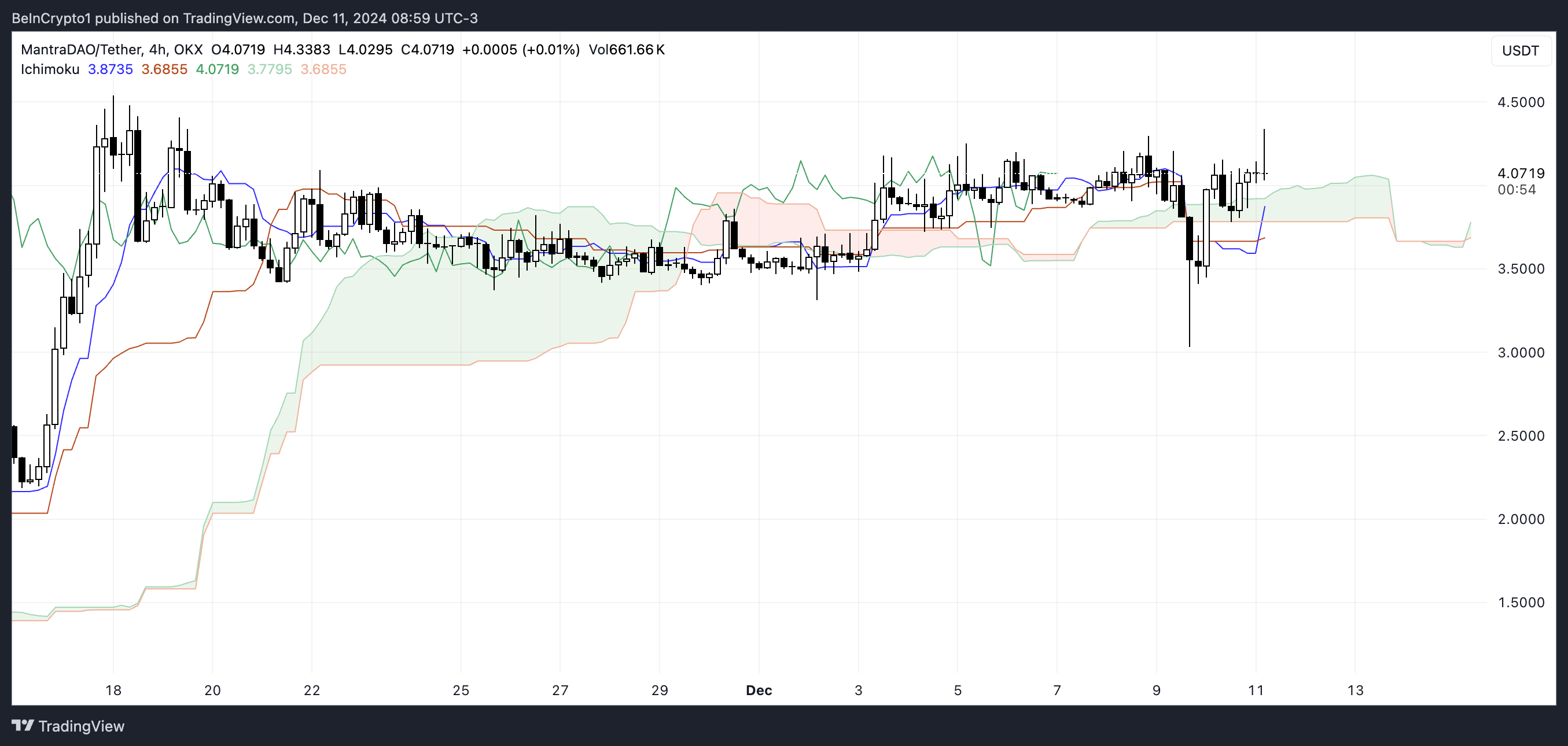 SponsoredGaris biru (Tenkan-sen) telah melintasi di bawah garis merah (Kijun-sen), yang merupakan sinyal bearish. Namun, awan hijau di depan menunjukkan bahwa harga Mantra masih bisa mempertahankan trajektori naiknya jika narasi RWA (Real-World Assets) memulihkan hype-nya.