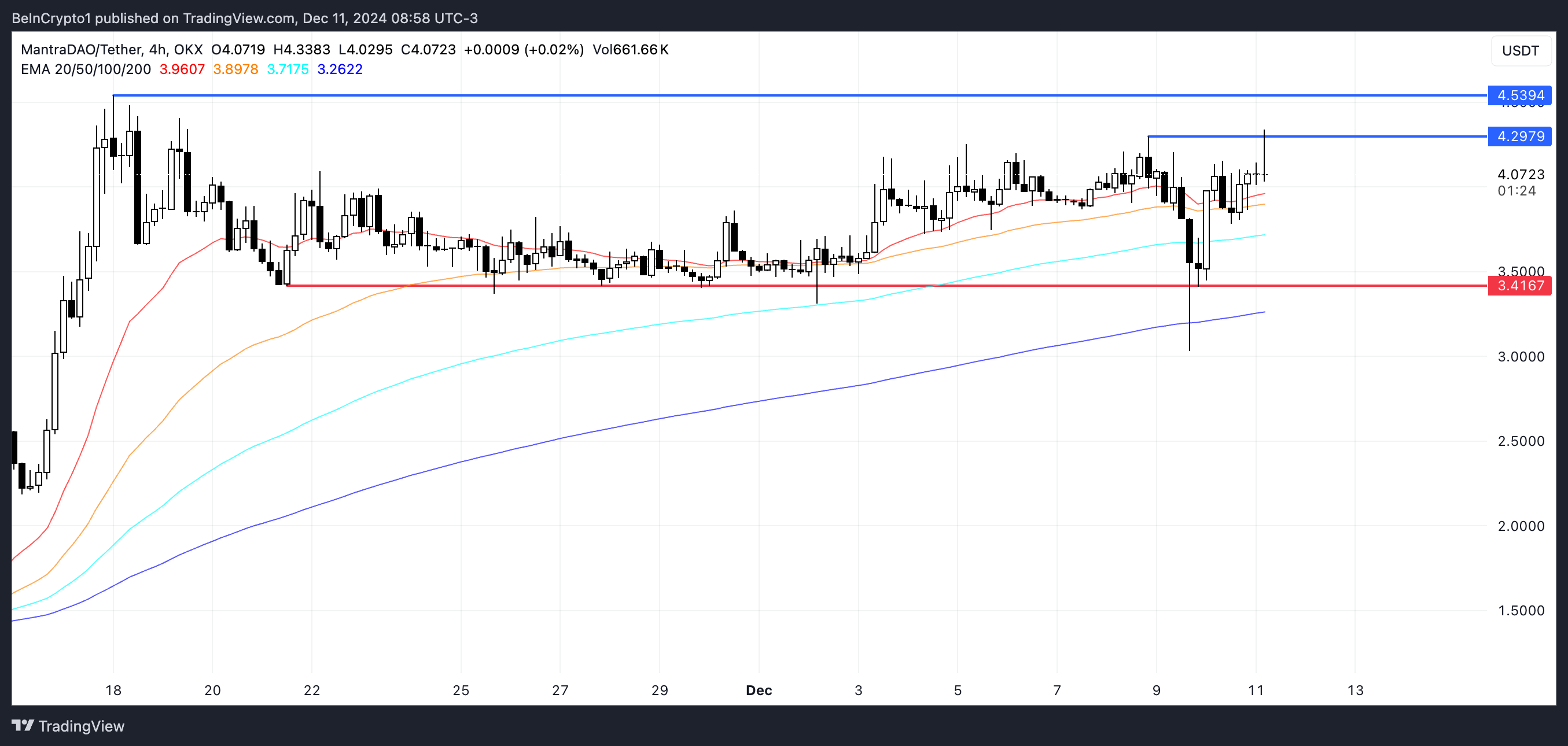 Jika tren naik berlanjut, OM bisa naik untuk menguji resistance di US$4,29, dan penembusan di atas level ini bisa mendorongnya menuju US$4,53, menandai rekor tertinggi baru dan menjadikan Mantra sebagai salah satu pemimpin di antara koin RWA.