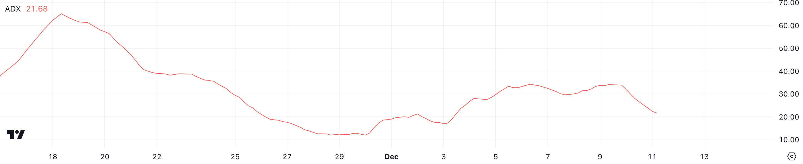 Mantra Average Directional Index (ADX) saat ini berada di 21,6, turun tajam dari 35 hanya sehari yang lalu. Penurunan ini menunjukkan bahwa kekuatan tren naik OM melemah, meskipun harga masih bergerak naik.