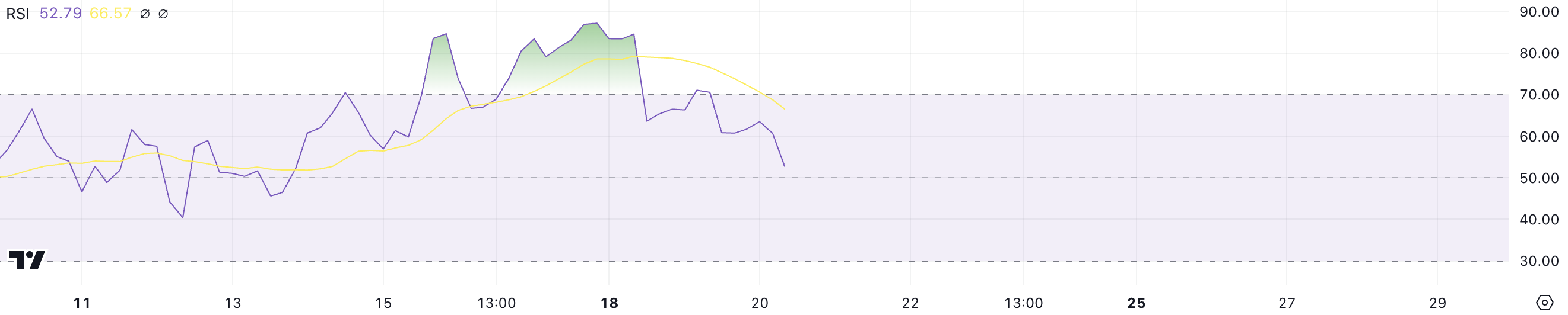 Relative Strength Index (RSI) OM saat ini berada di 52,7, turun dari level overbought yang dicapai antara 16 November dan 18 November ketika tetap di atas 70 dan harga Mantra mencapai rekor tertinggi baru, seiring narasi tentang aset dunia nyata (RWA) terus berkembang.