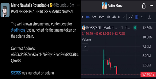 Pada hari Selasa, @RoundtableSpace mengumumkan peluncuran ROSS, mengklaim bahwa Adin Ross mendukung proyek tersebut. Tweet tersebut berisi alamat kontrak, seolah-olah melegitimasi meme coin tersebut. Namun, dalam waktu 20 menit, postingan tersebut dihapus, memicu skeptisisme langsung di komunitas kripto.