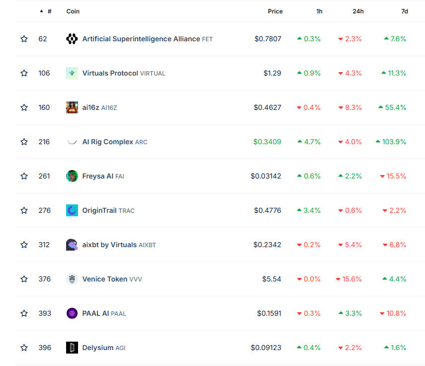 Sepuluh besar AI Agent crypto menunjukkan kinerja yang beragam. Satu token baru diluncurkan, tiga menderita penurunan dalam tujuh hari terakhir, dan enam lainnya mencatat apresiasi harga. AI16Z dan ARC memimpin gelombang pemulihan terbaru, memperlihatkan momentum kuat pada beberapa token tertentu.