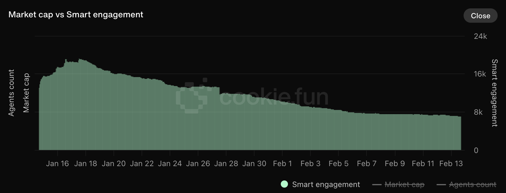 Keterlibatan akun pintar pada AI Agent crypto – wallet yang terkait dengan KOL atau trader profesional – konsisten menukik sejak 27 Januari. Akun-akun ini memainkan peran penting di pasar karena seringkali menunjukkan di mana investor berpengalaman memfokuskan perhatian mereka.