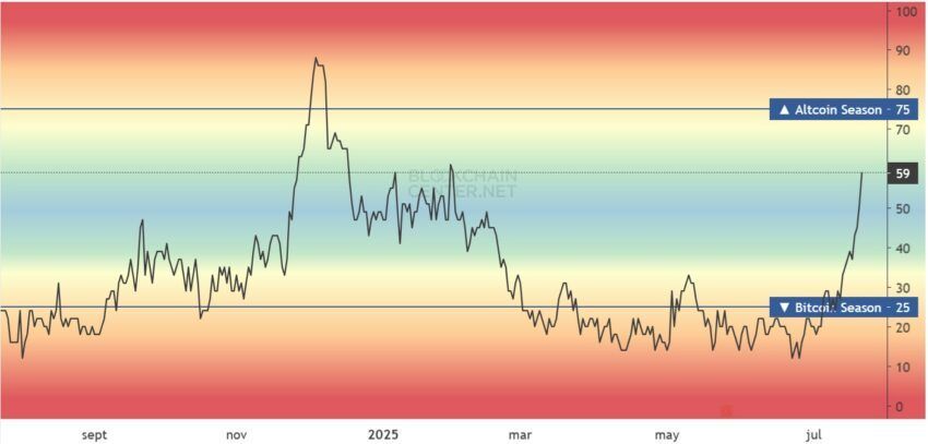 Setelah beberapa altcoin mengalami pelipatan harga selama akhir pekan, dan yang lain mencetak lonjakan mingguan, indikator momentum untuk aset-aset ini semakin menarik. Saat ini, arah indikator semakin mengarah ke altcoin season, dan Altcoin Season Index mencatat skor 59.
