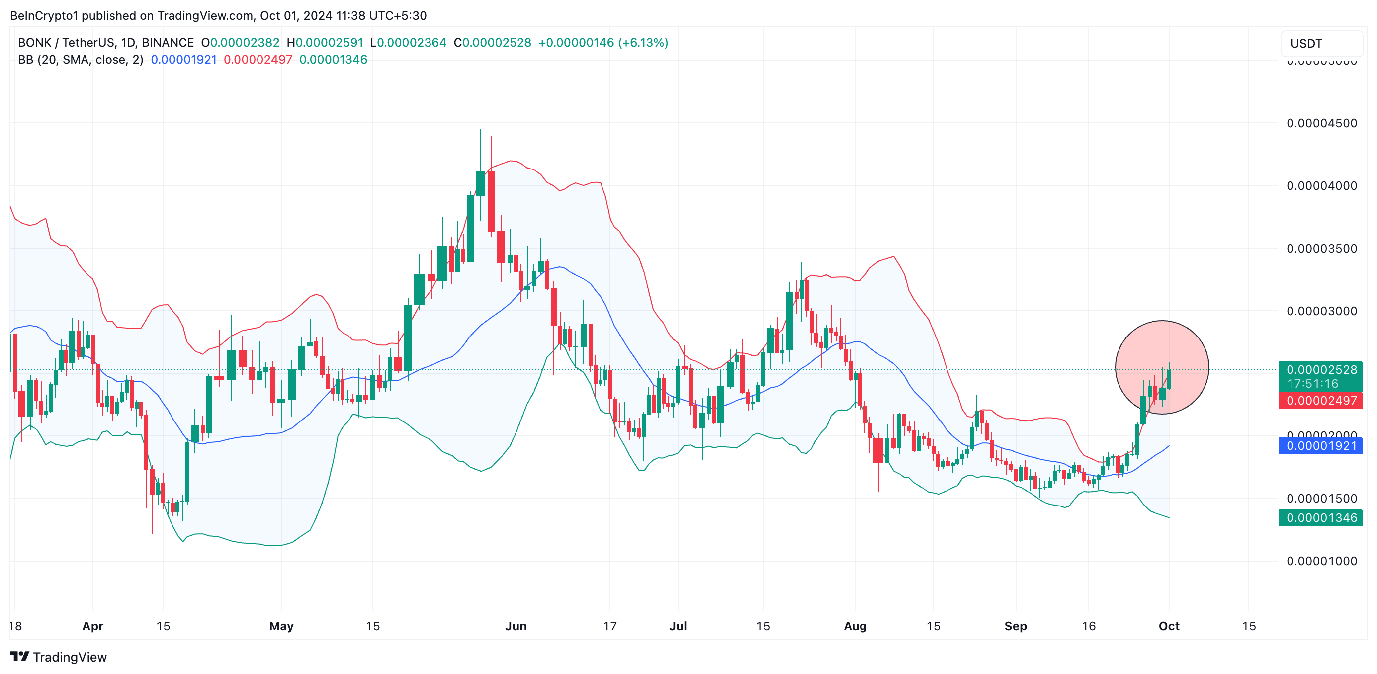 Lebih jauh lagi, reli dua digit BONK telah disertai dengan lonjakan volatilitas pasar yang signifikan, terlihat dari melebarnya indikator Bollinger Bands. Nah saat ini, BONK diperdagangkan sedikit di atas band atas dari penanda volatilitas ini.