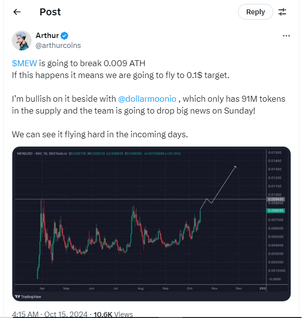 SponsoredMerespons hal itu, salah satu trader meme coin Arthur dalam utas X (Twitter) menyebut, bahwa MEW bakal menembus ATH di US$0,009. Jika hal itu terjadi, maka token tersebut berpeluang terbang ke target harga US$0,1.