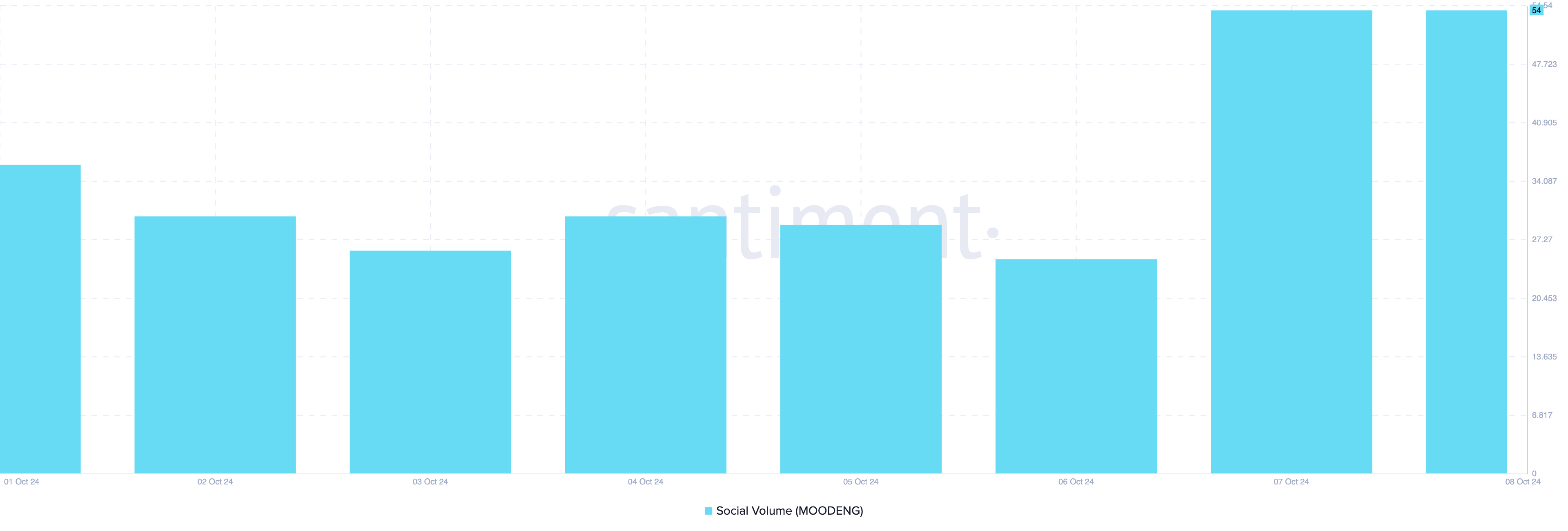 Sejalan dengan lonjakan sentimen positif, volume sosial untuk meme coin Solana ini juga melesat. Jika tren ini berlanjut, perkembangan ini dapat membantu mempercepat pemulihan harga MOODENG.
