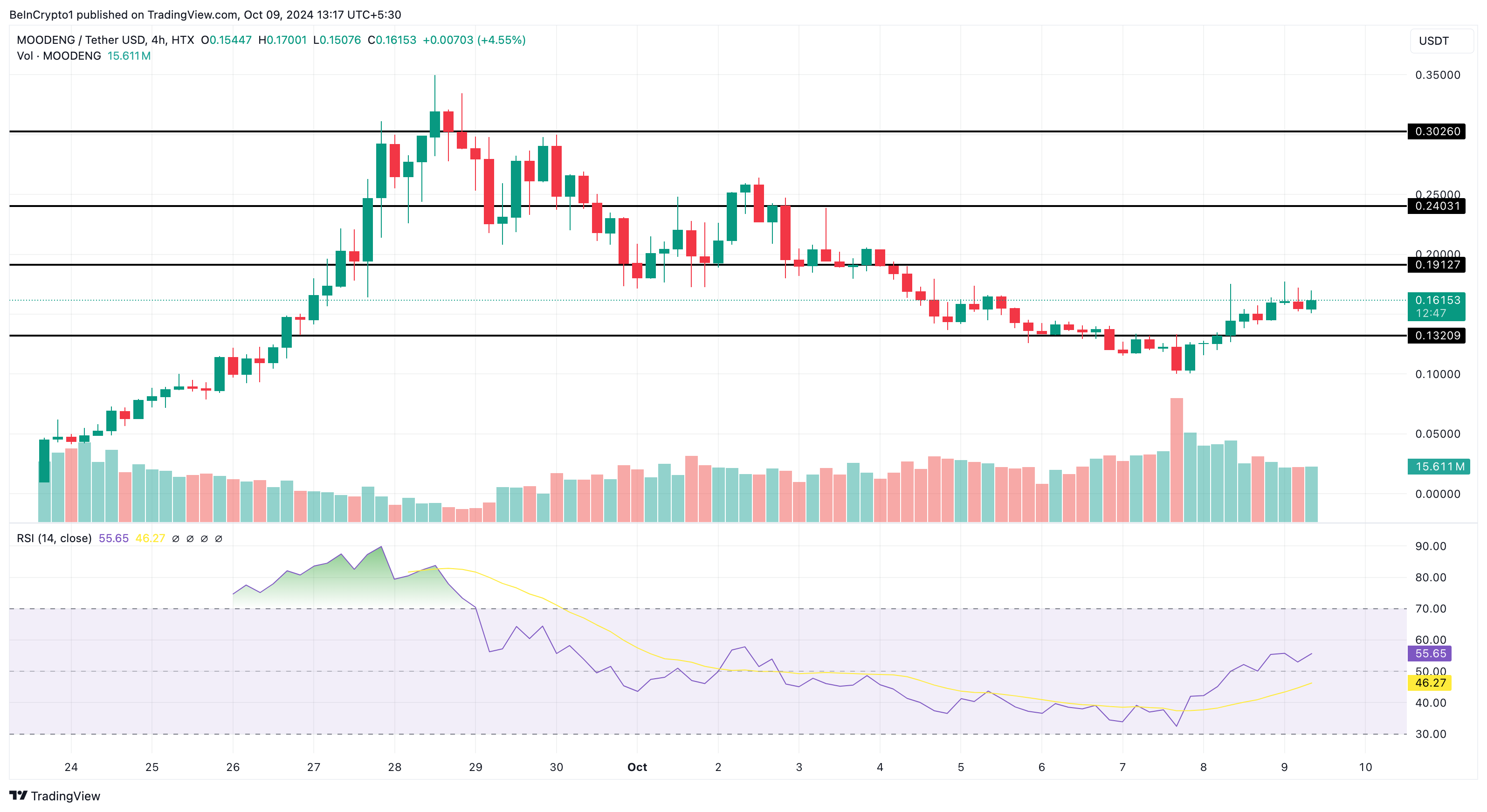 Dengan harga MOODENG yang terus meningkat dengan cepat, naiknya RSI menandakan bahwa momentum sekarang bersifat bullish. Selama kondisi ini tetap bertahan, meme coin ini mungkin bisa menembus resistance US$0,19.
