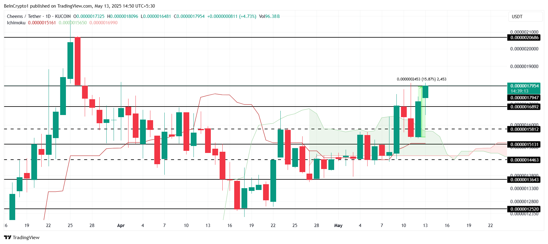 CHEEMS telah naik sebesar 15,87%, mencapai level tertinggi dalam satu setengah bulan. Meme coin ini mengalami tren naik selama sebulan yang mengubah momentumnya, membawa harganya ke US$0,000001795. Pertumbuhan ini mencerminkan perubahan sentimen pasar, menempatkan CHEEMS untuk potensi lebih lanjut.