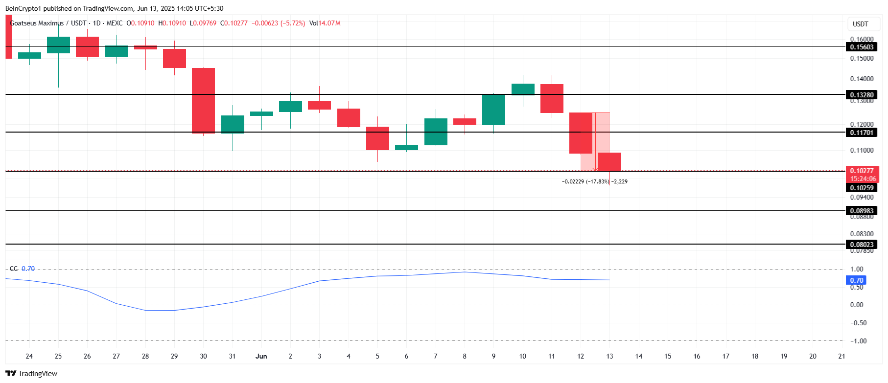 GOAT, seperti banyak meme coin lainnya, mengalami kerugian signifikan akibat kondisi pasar bearish makro, turun 17,8% dalam 24 jam terakhir. Altcoin ini saat ini diperdagangkan pada US$0,102. Aksi harga ini sangat dipengaruhi oleh tren pasar yang lebih luas, terutama pergerakan Bitcoin.