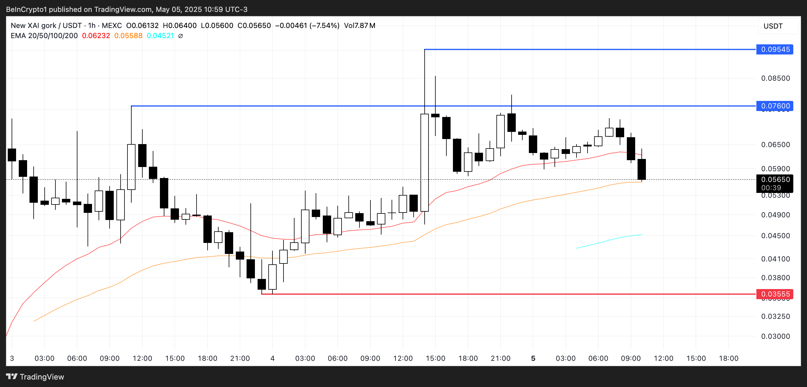 Namun, andaikata sentimen pasar berubah atau hype mulai memudar, GORK berpotensi ambruk tajam ke level support US$0,035.