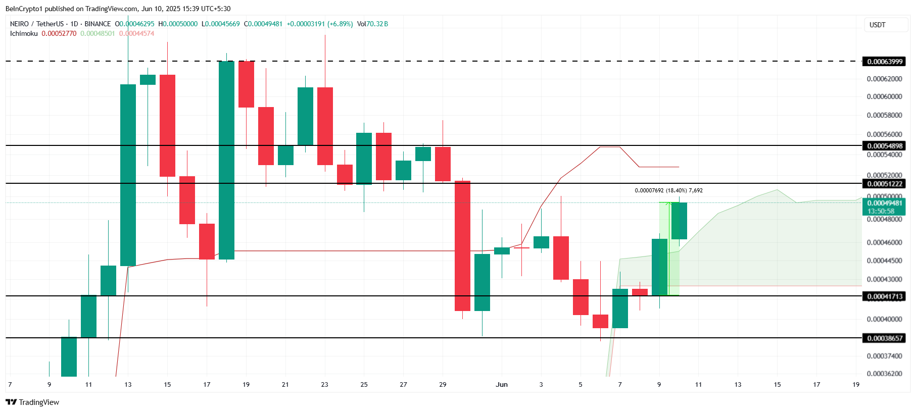 Indikator Ichimoku Cloud di bawah candlestick menunjukkan bahwa penembusan US$0,000512 bisa mendorong NEIRO ke US$0,000548. Potensi kenaikan ini akan memperpanjang keuntungan bagi holder NEIRO, memperkuat pandangan bullish. Jika momentum berlanjut, meme coin ini bisa mencapai level baru dalam waktu yang relatif singkat.