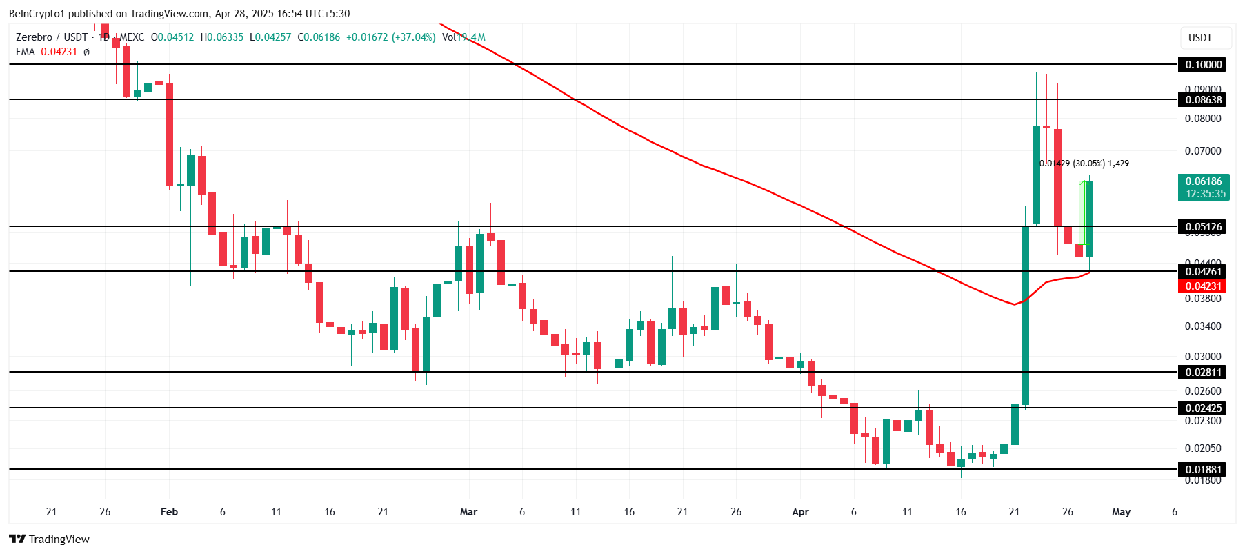 ZEREBRO telah melonjak 30% dalam 24 jam terakhir, diperdagangkan pada US$0,061. Meme coin ini menunjukkan momentum bullish yang kuat dan nampaknya siap melanjutkan tren naiknya.
