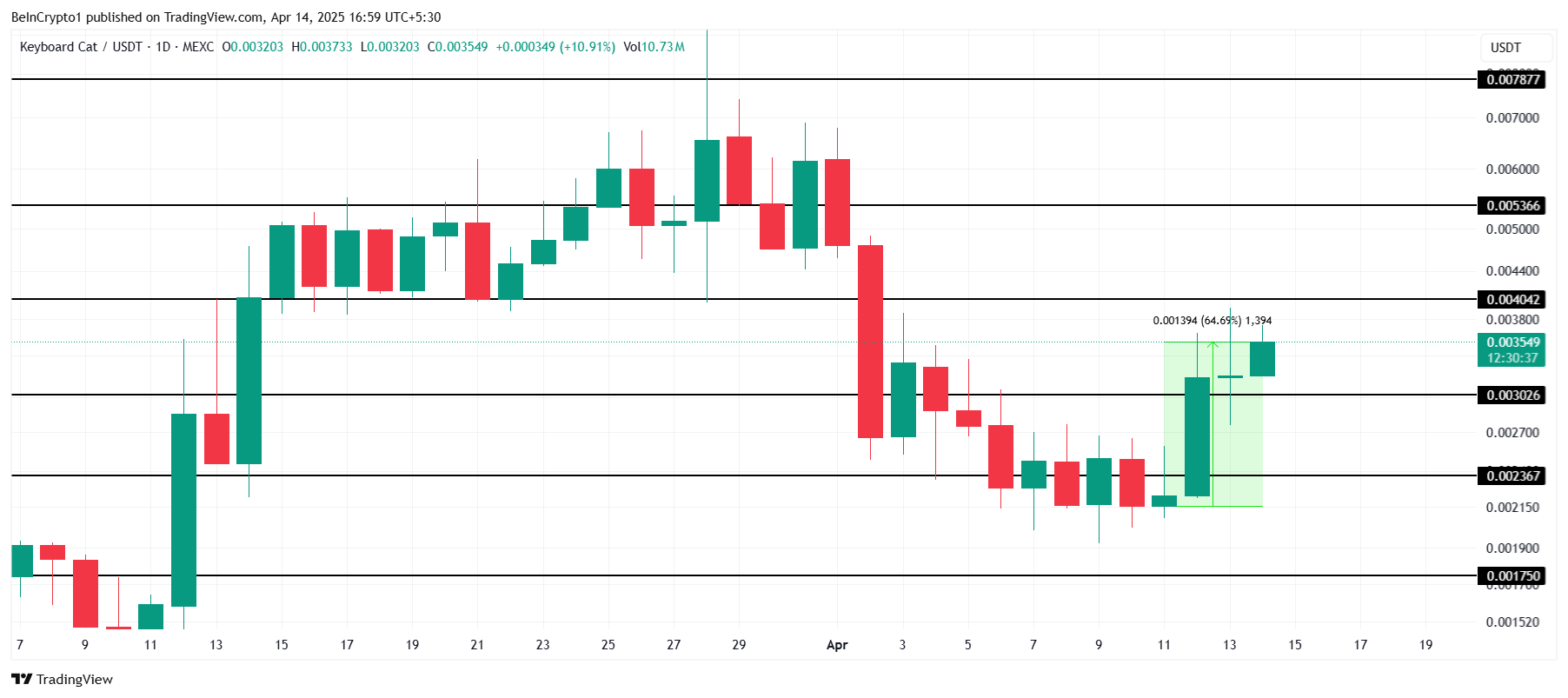 Harga KEYCAT mengalami kenaikan moderat sebesar 11% hari ini, mencapai US$0,0035, melanjutkan reli dari minggu sebelumnya yang kini totalnya mencapai 64%. Meskipun tidak sebaik MANEKI, tren naik yang konsisten ini bisa menarik perhatian investor.