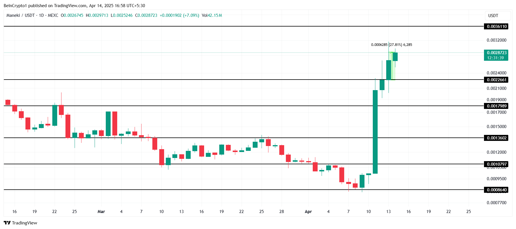 Harga MANEKI melonjak hampir 28% dalam 24 jam terakhir, mencapai US$0,0028. Kenaikan signifikan ini menandai kelanjutan reli altcoin dari minggu sebelumnya.