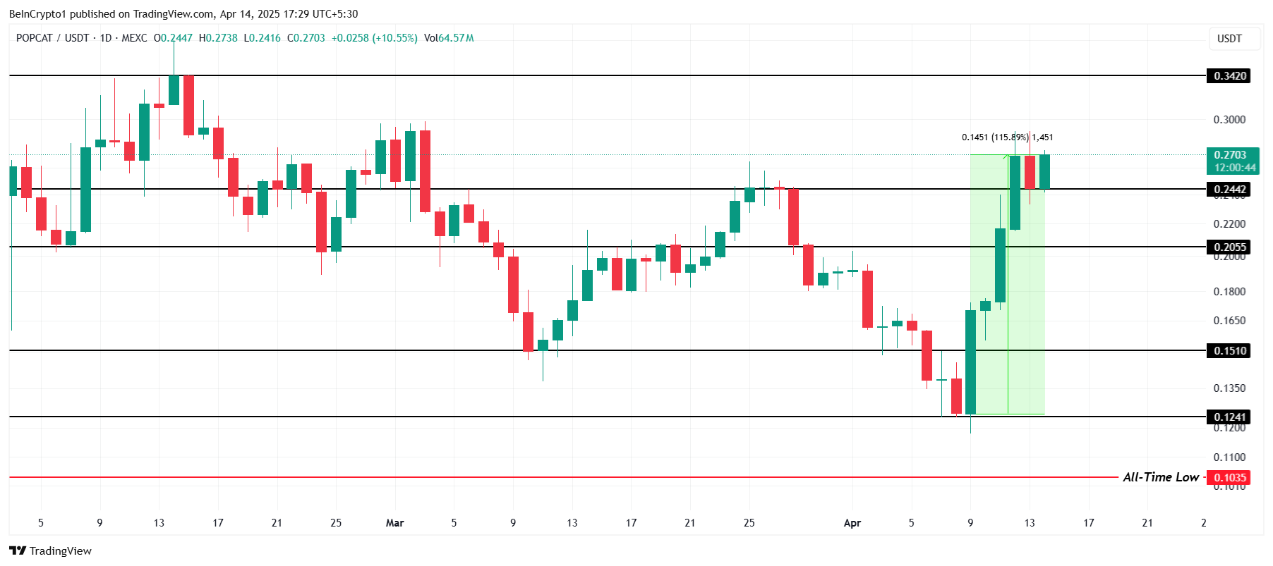 POPCAT mengalami kenaikan mengesankan sebesar 115% selama minggu lalu, menempatkannya sebagai salah satu token dengan performa terbaik. Namun, meskipun lonjakan ini, meme coin ini mengalami sedikit penurunan dalam 24 jam terakhir. Volatilitas ini menandakan kemungkinan perubahan, meskipun prospeknya tetap umumnya positif.