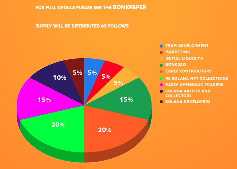 Sekitar 20% dari total suplai airdrop BONK akan diberikan ke koleksi non-fungible token (NFT) Solana, yang terdiri dari 297.000 NFT individu, 15% untuk pedagang openbook awal, 10% kepada artis dan kolektor Solana, dan 5% untuk para developer Solana. Adapun semua kontributor awal akan dikenakan linear vesting selama 3 tahun.