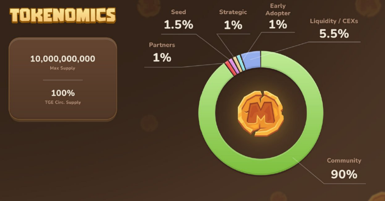 Mengacu pada tokenomics-nya, MemeFi akan memiliki total pasokan sebanyak 10 miliar token, di mana 90% di antaranya akan didistribusikan ke komunitas melalui skema airdrop. Alokasi terbesar kedua, yakni 5,5%, bakal digunakan untuk likuiditas, dan masing-masing 1% untuk adopsi awal, mitra, serta strategis.