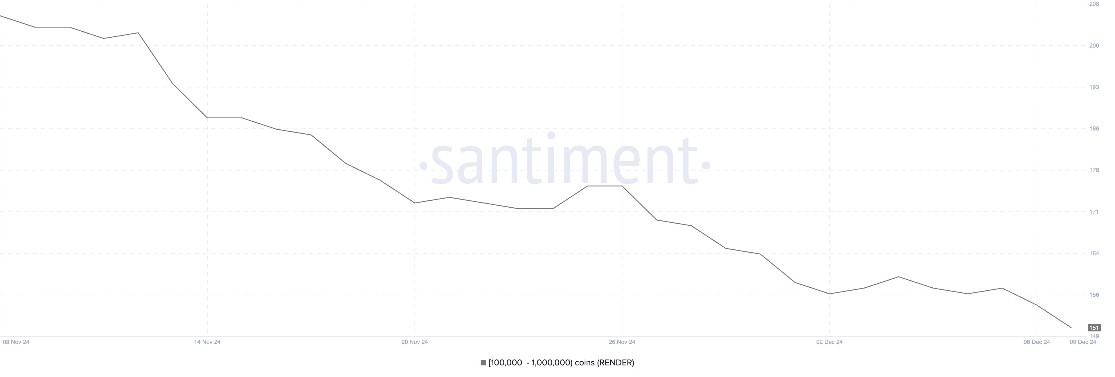 Walaupun harga RENDER naik 56% dalam 30 hari terakhir, dengan kapitalisasi pasarnya kini mendekati US$5 miliar, terbesar di antara koin kecerdasan buatan, aktivitas whale menunjukkan cerita berbeda. Jumlah alamat yang memegang antara 100.000 hingga 1.000.000 RENDER turun menjadi 151, level terendah sejak Desember 2022.