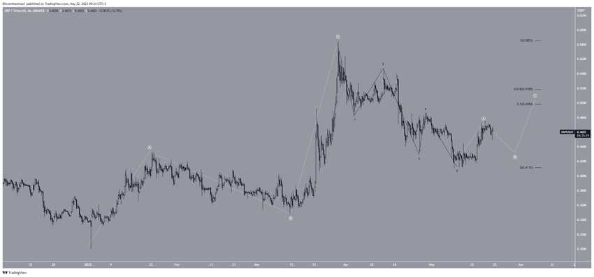 Jika benar begitu, maka target puncak kenaikan harga yang paling mungkin terjadi adalah di level US$0,50-US$0,52, yang diciptakan oleh level retracement resistance Fib 0,5-0,618.
