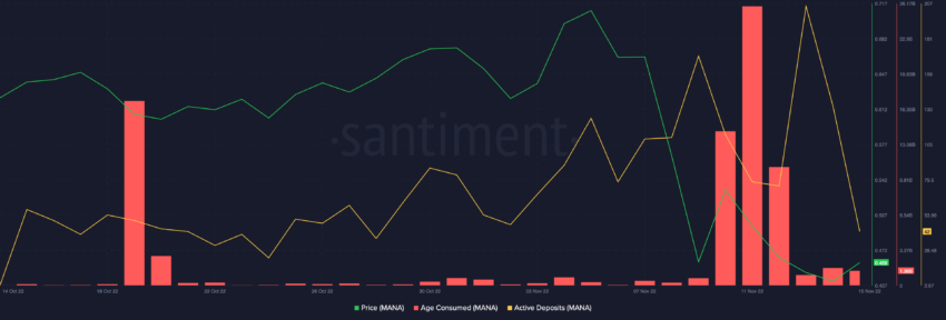 Selanjutnya, data dari Santiment menunjukkan bahwa terdapat anomali tertentu dalam beberapa metrik on-chain untuk Decentraland pada saat publikasi. Jumlah deposit aktifnya mengalami lonjakan besar pada tanggal 13 November, tetapi setelah itu perlahan kembali turun. Lonjakan deposit aktif seperti ini biasanya mengarah ke aksi jual berskala masif atau market sell-off yang juga merupakan sinyal bearish.