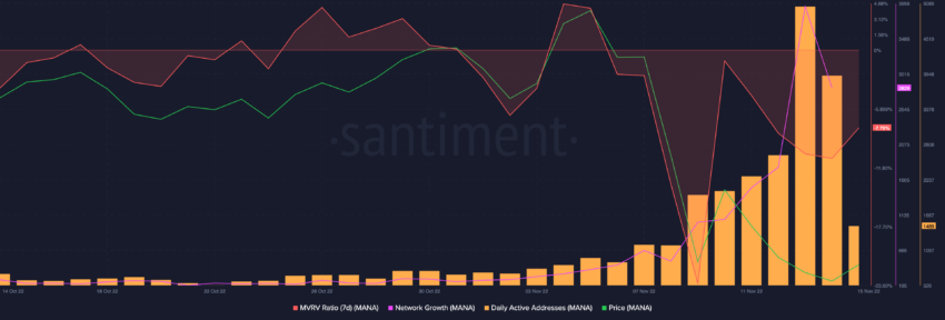 Sementara itu, rasio MVRV dalam timeframe tujuh hari untuk MANA menunjukkan adanya sedikit pemulihan, namun tokennya masih ‘undervalued.’ Rasio MVRV tujuh-hari ini berhasil memberikan sedikit kelegaan bagi MANA, tetapi hal ini juga mengindikasikan bahwa perjalanannya menuju pemulihan sempurna masih jauh.
